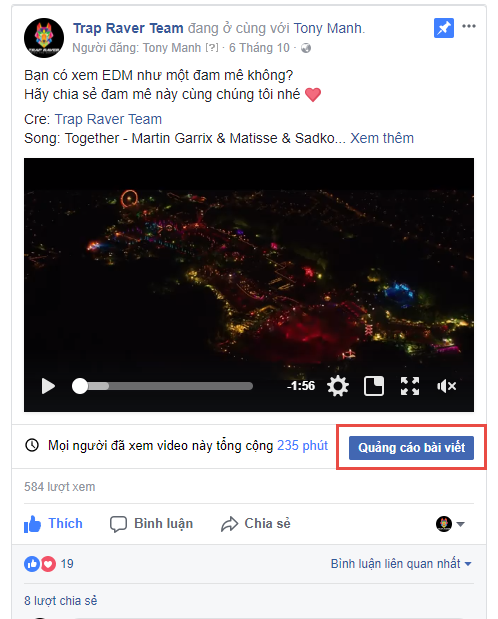 Cách đơn giản nhất để chạy quảng cáo Facebook một bài viết là click vào nút xanh Quảng cáo bài viết phía dưới post hoặc Quảng cáo sự kiện đối với quảng cáo sự kiện trên Facebook.