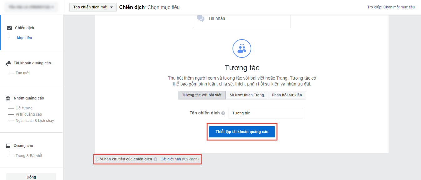 Sau khi click chọn mục tiêu, bạn kéo xuống phía dưới màn hình, nhập tên chiến dịch quảng cáo Facebook và click nút Thiết lập tài khoản quảng cáo để tạo tài khoản quảng cáo facebook cho mình. Bạn cũng có thể thiết lập giới hạn chi tiêu cho chiến dịch quảng cáo này bằng cách click vào Đặt giới hạn ở cuối trang.