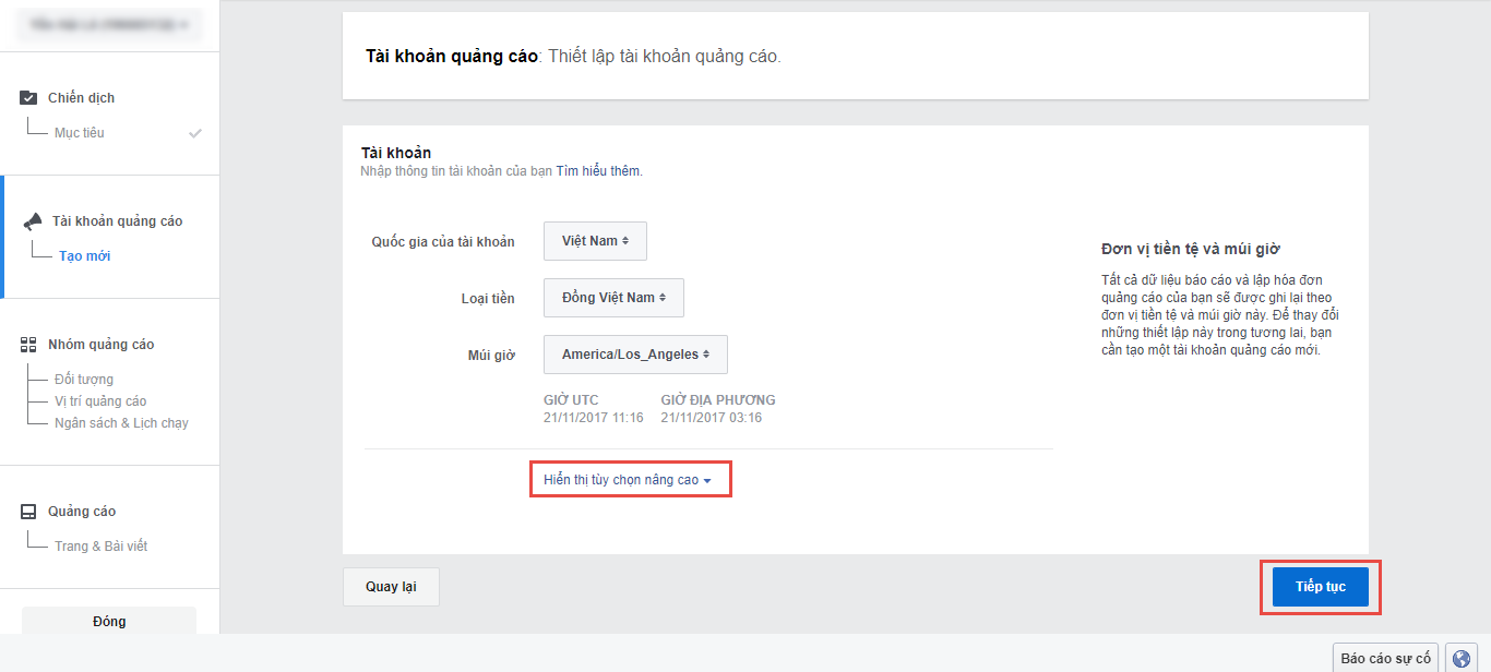 Nếu là lần đầu tiên chạy quảng cáo Facebook thì bạn cần thiết lập tài khoản quảng cáo với các thông tin như Quốc gia, Loại tiền, Múi giờ. Ngoài ra, bạn có thể thay đổi tên tài khoản quảng cáo bằng cách click vào Hiển thị cài đặt nâng cao. Sau khi hoàn thành thiết lập tài khoản quảng cáo, bạn click nút Tiếp tục.