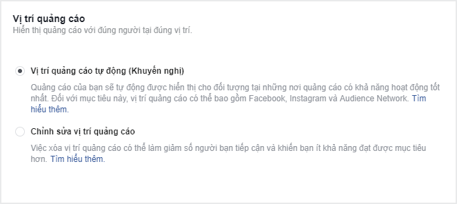 Tiếp theo, bạn lựa chọn vị trí để đặt quảng cáo trên Facebook. Ở đây bạn có 2 lựa chọn Vị trí quảng cáo tự động và Chỉnh sửa vị trí quảng cáo.