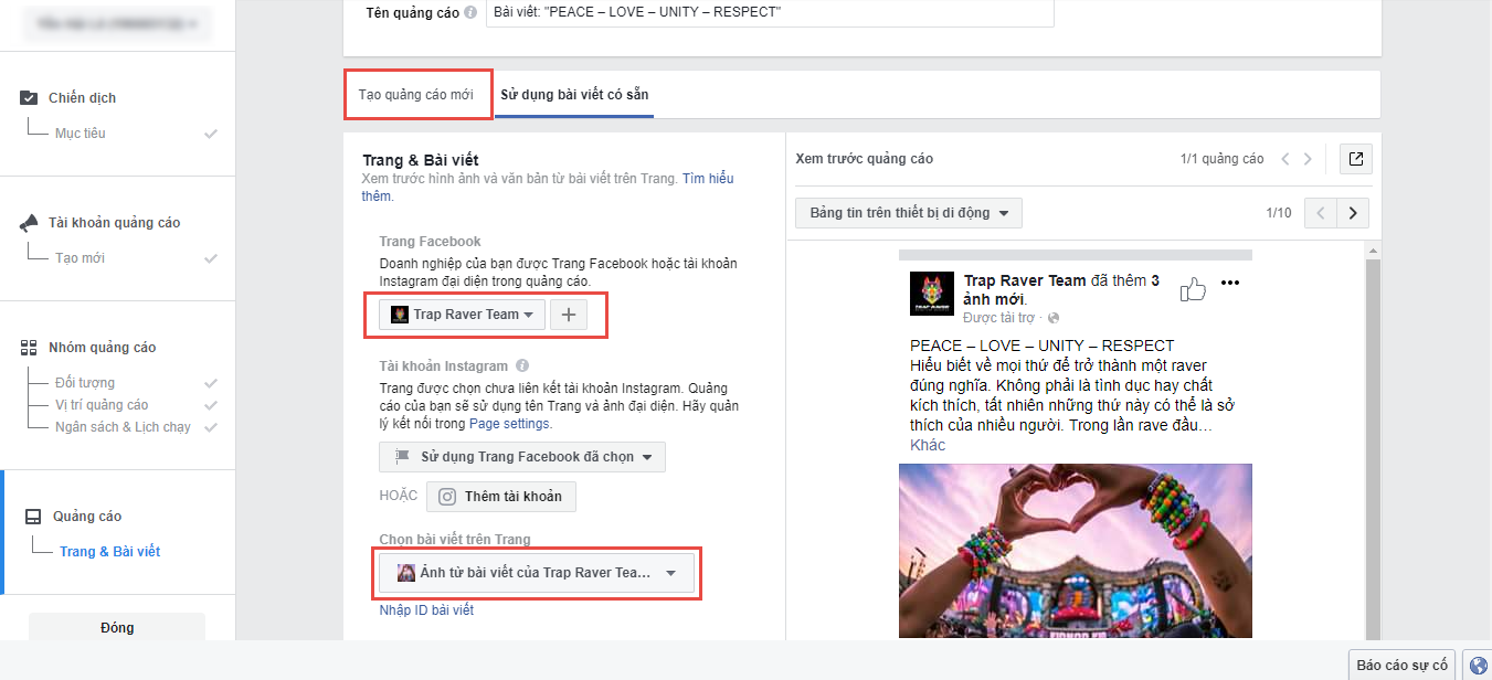 Để lựa chọn page sẽ quảng cáo, bạn bấm vào menu thả Trang Facebook sẽ hiện ra danh sách các fanpage bạn đang quản trị. Bấm vào chọn bài viết hoặc nhập ID bài viết để lựa chọn bài viết sẽ quảng cáo. Nếu muốn tạo một post quảng cáo mới bạn click vào Tạo quảng cáo mới trên menu phía trên, tại đây bạn có thể tải lên ảnh, video hoặc bản trình chiếu và viết nội dung quảng cáo cũng như thêm nút CTA cho bài viết…