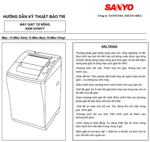 Tài liệu hướng dẫn kỹ thuật bảo trì máy giặt SANYO Mã ASW-U700VT